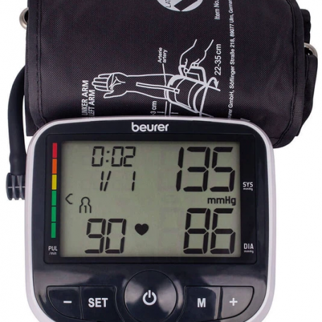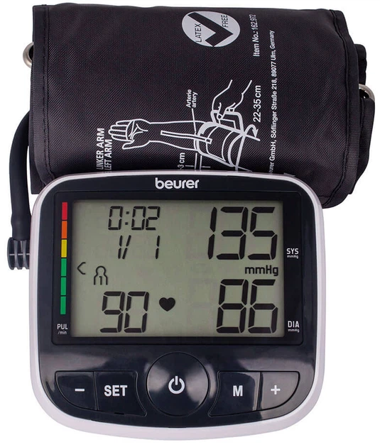 Автоматичний тонометр для вимірювання кров'яного тиску в плечовій артерії німецького бренда Beurer, BM 40 (з адаптером) винятково простий і зручний у застосуванні. Прилад для вимірювання кров'яного тиску в плечовій артерії – з показом виміряного тиску та пульсу на великому екрані, що дає змогу людям із різною гостротою зору чітко й однозначно зчитувати результати вимірювання з екрана приладу. Компактна конструкція та чітка індикація для зручного моніторингу кров'яного тиску. За допомогою приладів для вимірювання кров'яного тиску в плечовій артерії вимірювання здійснюють безпосередньо на висоті серця, що дає змогу отримувати точні результати.